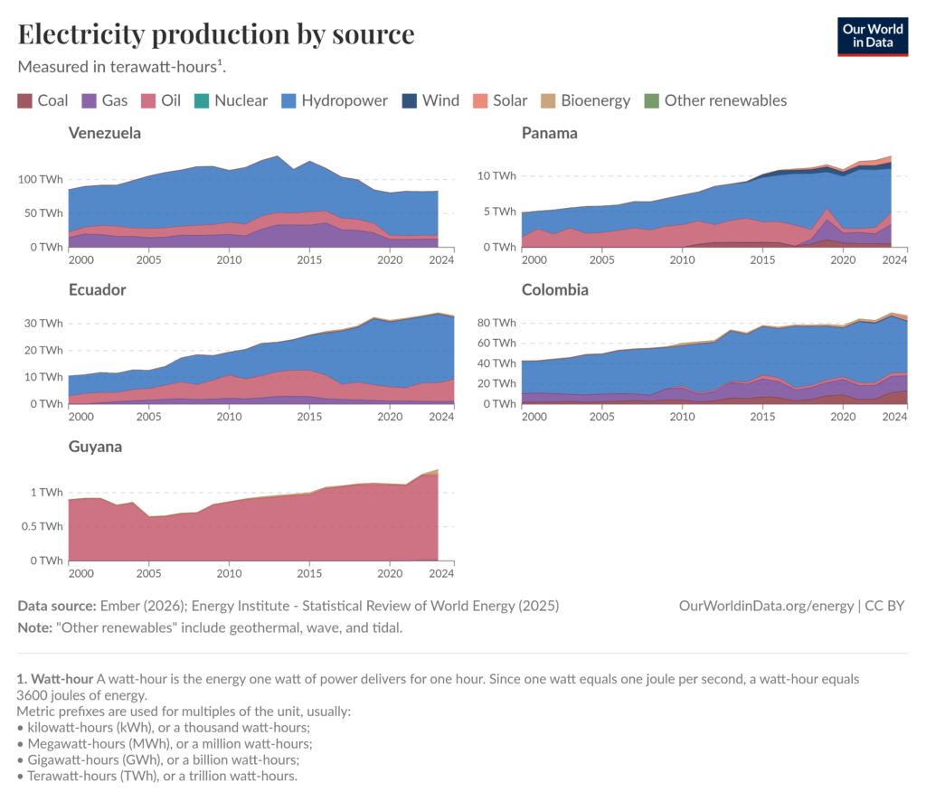 Głównym źródłem energii w regionie są ropa naftowa i gaz ziemny. Wenezuela dysponuje największymi na świecie potwierdzonymi rezerwami ropy (ok. 303 mld baryłek), choć realna produkcja spadła do poziomu ok. 1 mln baryłek dziennie. Inne kraje również zajmują się wydobyciem ropy, jednak nie w takim stopniu, jaki robi to już wcześniej wspomniana Wenezuela. Dodatkowo w regionie ważnym źródłem energii jest energia wodna. W Kolumbii, Ekwadorze, Wenezueli i Panamie hydroelektrownie dostarczają od 60 do ponad 80% prądu, a gaz ziemny pełni rolę uzupełniającą, zwłaszcza w okresach trwania El Niño lub La Niña, zapewniając stabilność energetyczną. Warto wspomnieć, że region, pomimo położenia, posiada dość czystą produkcję energetyczną. Tak jak wspomniałem wcześniej większość energii pochodzi z elektrowni wodnych i jest uzupełniana gazem ziemnym, dodatkowo coraz popularniejsze stają się panale fotowoltaiczne oraz turbiny wiatrowe.